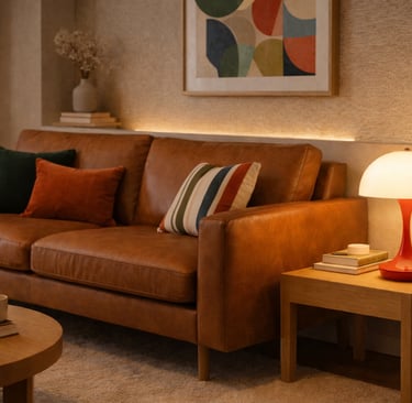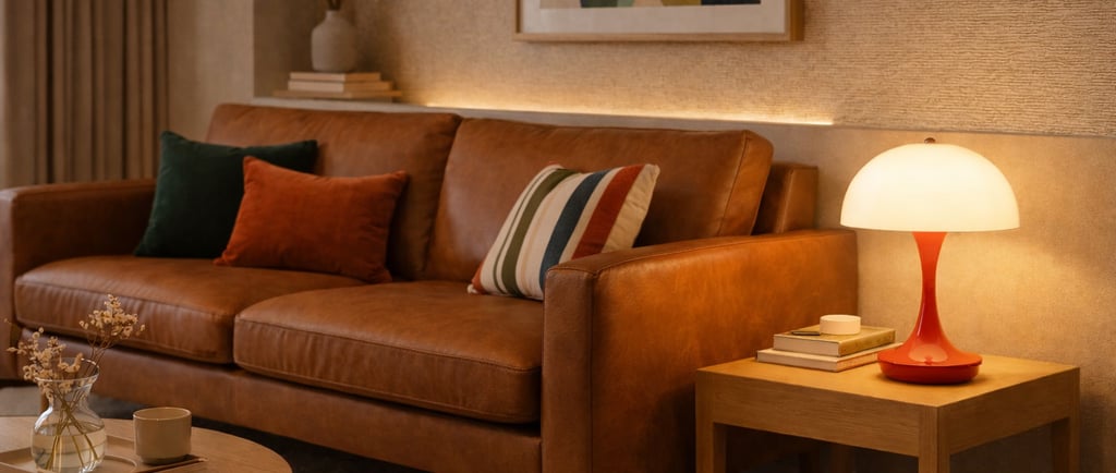 Quando posicionadas em aparadores, mesas laterais ou mesas de apoio em frente ao sofá, essas luminárias ajudam a suavizar o ambiente, equilibrando a luz geral e valorizando móveis como sofás em couro, obras de arte e objetos decorativos.